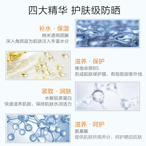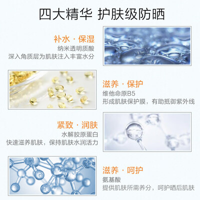 蕴含双倍透明质酸、水解胶原蛋白等成分,加倍发挥保湿功效,防晒的同时持续锁水。