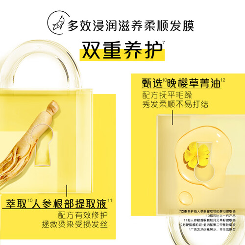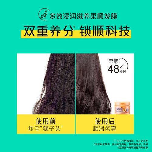 显著修护毛糙发质,在秀发表面形成滋养膜,爽滑秀发并将浓郁的滋养锁入发丝,令秀发如焗过油般垂坠顺滑,柔润亮泽,修护毛糙。