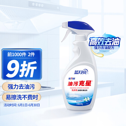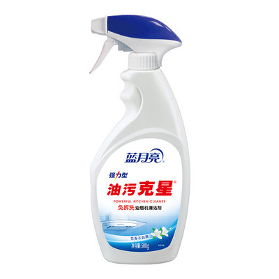 蓝月亮油烟机清洗剂可以迅速渗透油污内部,软化厚重油污,无需拆洗,省时省力,同时散发姜花香,清新不刺鼻。