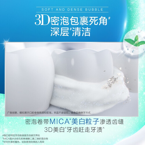 蕴含3D密泡泡,能轻松带走深藏牙垢,减少口臭、牙黄等口腔问题。清爽薄荷香气,帮助追求口腔健康的你保持清新口气。