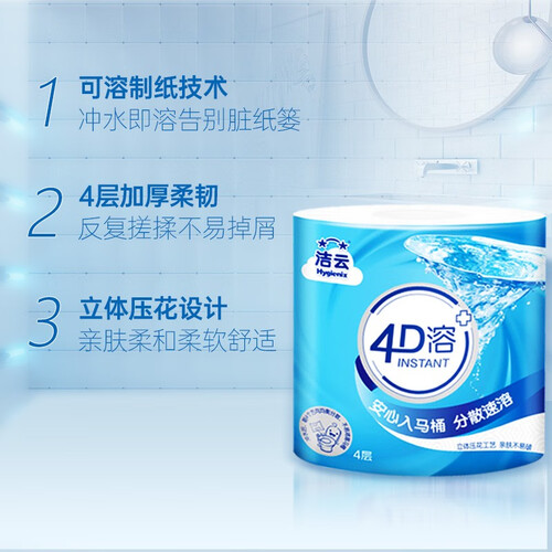 四层加厚|家里有大宝和二宝,爸爸妈妈该怎么选择卫生纸?采用4D立体压花工艺,使用起来更方便,还能有效节约用纸。四层加厚设计,湿水也不破,让你更安心。