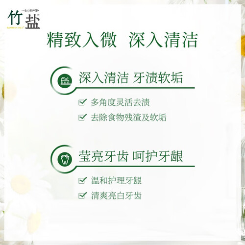 小小的刷头中蕴含竹盐提取物,可以将竹盐送入到口腔深处,增加了清洁力度。小刷头和软毛的结合,清洁的力度和深度都很不错。