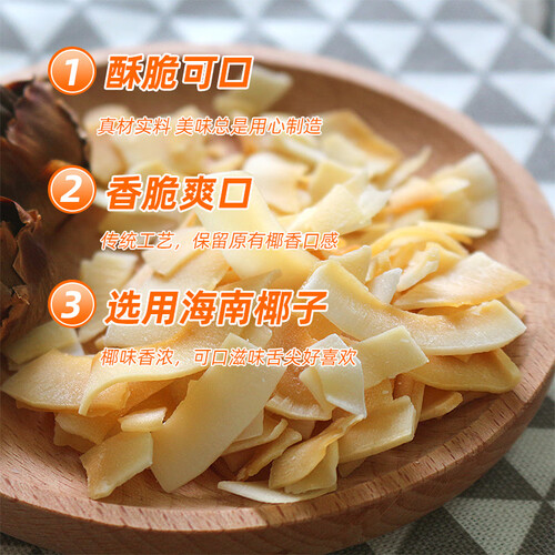 采用晒足阳光的海南好椰子,椰香浓郁,让你感受到沐浴阳光的海南风味。传统炭烧工艺而成,成就椰片小巧薄脆,口感更佳。