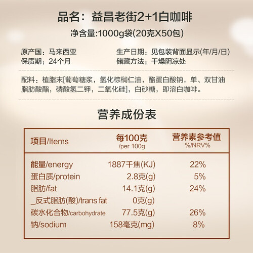 精心选材 | 这款咖啡精选用哥伦比亚和巴西的优质咖啡豆,保证酸甜平衡,通过科学剂量配比,完美拼配出这款香浓润口的白咖啡。咖啡内不含香精,让你喝得健康。