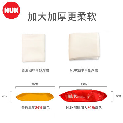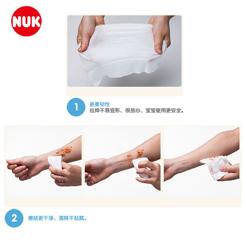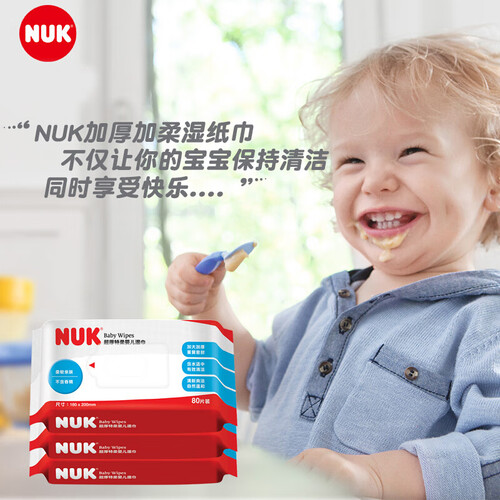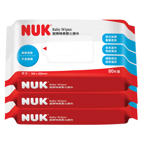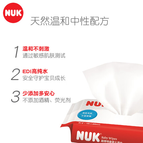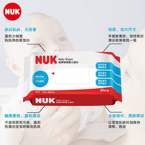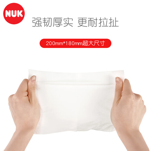 这款NUK婴儿湿巾,采用无纺布和纯净水制作,亲近宝宝娇嫩肌肤;加厚加大的尺寸,一张湿巾就能帮宝宝清洁污渍,方便耐用。