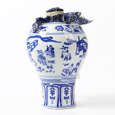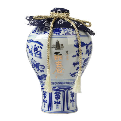 选用青花瓷瓶搭配流苏和花兰花布进行包裹,诠释中式古典的风韵,喝完酒后还是一件很好看的花瓶,纯天然的食材酿造,自然美味。