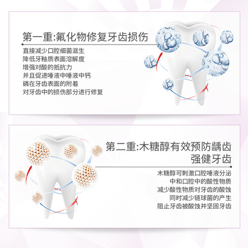 蕴含木糖醇的成分,可减少酸性物质对牙齿的酸蚀同时能阻止牙齿被酸蚀并坚固牙齿,为你带来一口健康的牙齿。