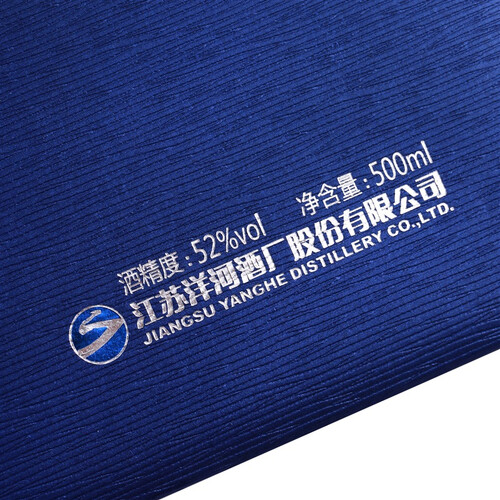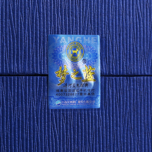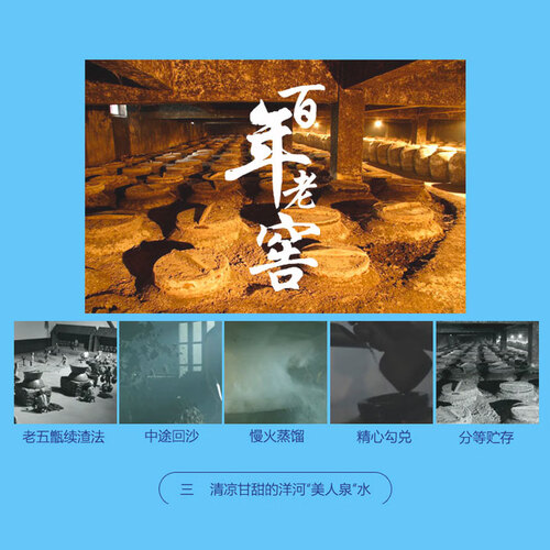 绚丽多姿的瓶盖,自引万千大赏,蓝色水滴,典雅而庄重,水波纹饰,轻盈柔美,低温入窖,高温制曲,发酵储存周期长,好酒好味。
