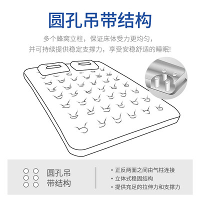 这款充气床垫采用植绒表面,使其造型立体感更强,其触感柔和舒适;蜂窝结构,利用多个空气浮力能将人的身体均匀托起。