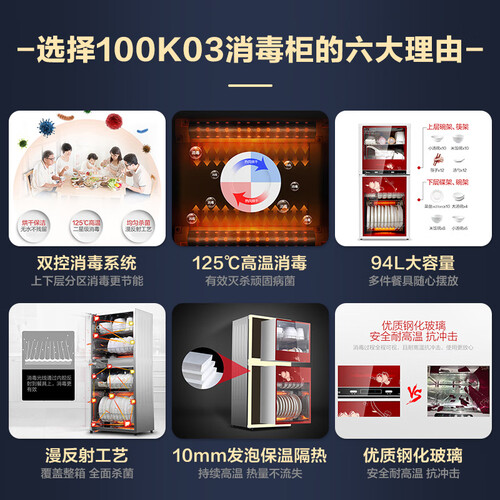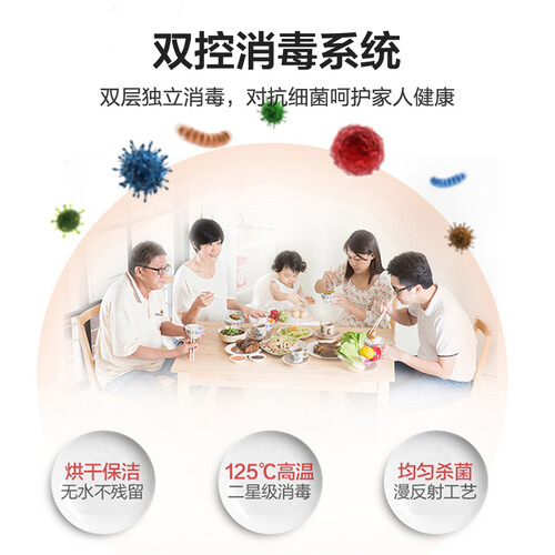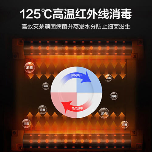 上层中温烘干,下层125℃高温+红外线消毒,辅以漫反射工艺均匀反射消毒光线覆盖全箱,高效灭杀细菌。立式造型,安装不占地。