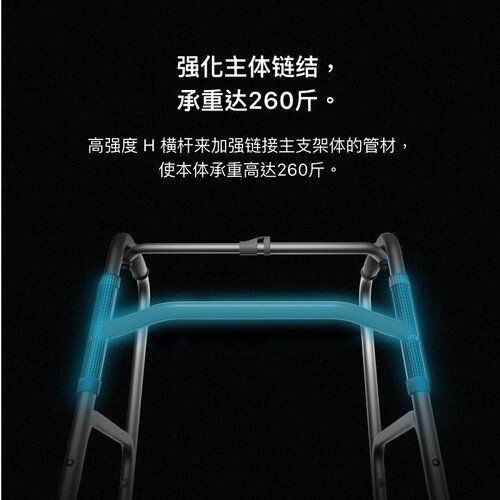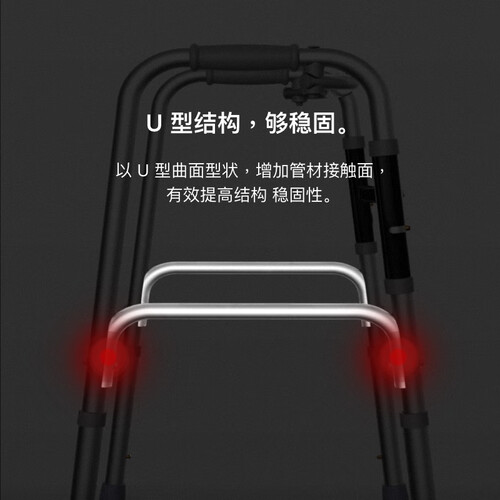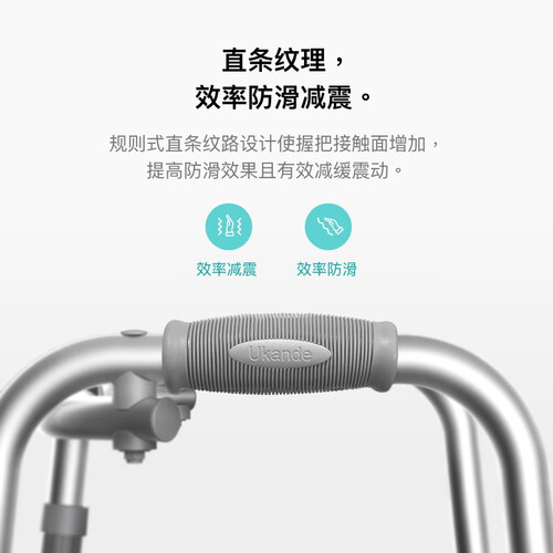 优康德助行器为铝合金主体结构,表面经阳极处理,轻便坚固,同时两侧的边管设计及防滑橡胶脚垫等人性化设计,让使用更方便。