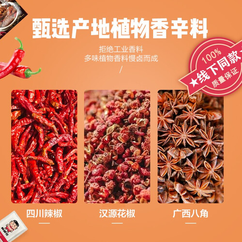 使用传统的植物香料调味,拒绝工业香辛料,更健康美味,可安心食用。选用香辣老卤汁卤制,辣而不燥,食用口感鲜美。