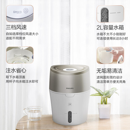 飞利浦的这款加湿器通过360°均匀加湿,滋润更加全面彻底,身心更舒适。并且支持自动湿度设置,便捷无需反复调试。