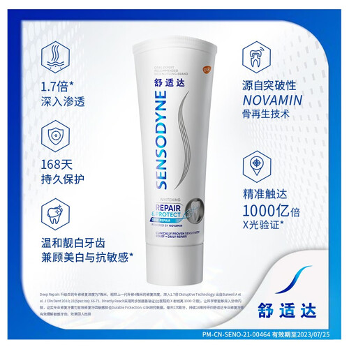 专为敏感牙齿研制,缓解牙敏感,并帮助恢复牙齿自然亮白。突破性的Novamin技术,修护牙本质小洞,直击敏感根源。