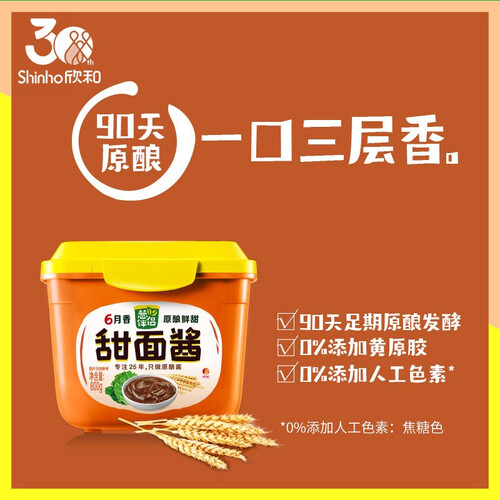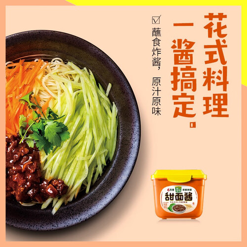 欣和甜面酱从豆到酱全程自然发酵而成,零添加黄原胶、人工色素,酱香浓郁,口感绵甜,让主食不再无味。