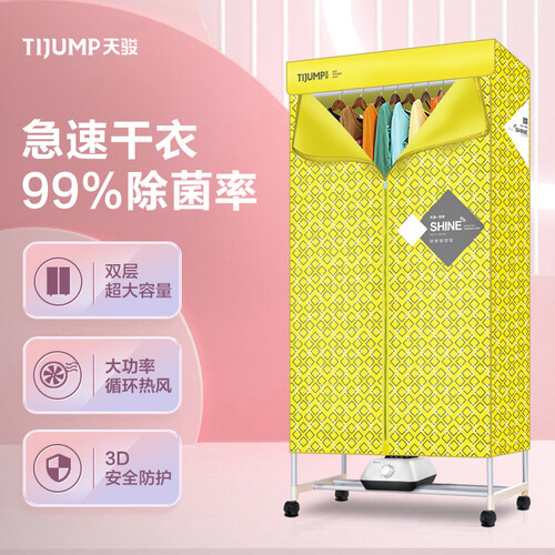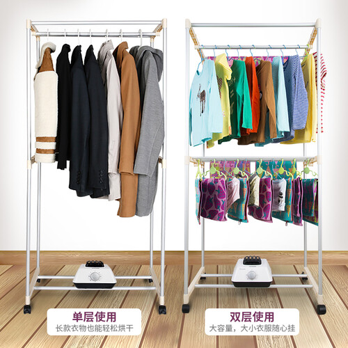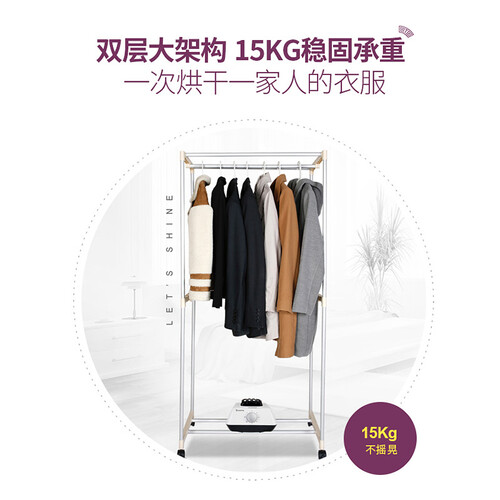 采用双层设计,增加了干衣机的内部容量,减少衣物烘干频次。双层大容量设计,可容纳15-20件衣物。可拆卸设计,清洗更方便。