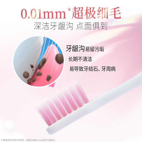 采用0.01mm柔软细毛设计,深入洁净口腔,搭配流线型刷柄设计,方便持握,清洁体验更舒适。