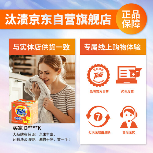含有360度洁净力,有效清除顽固污渍,还原衣物洁净面貌;洗后衣物散发清新柠檬香,近距离接触无异味尴尬,维护个人社交形象。