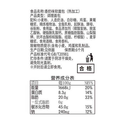 达利园香奶味法式软面包以小麦粉、乳粉、鸡蛋等原料制作,保留了原材料的香甜滋味,入口后的口感也十分醇厚且绵弹。