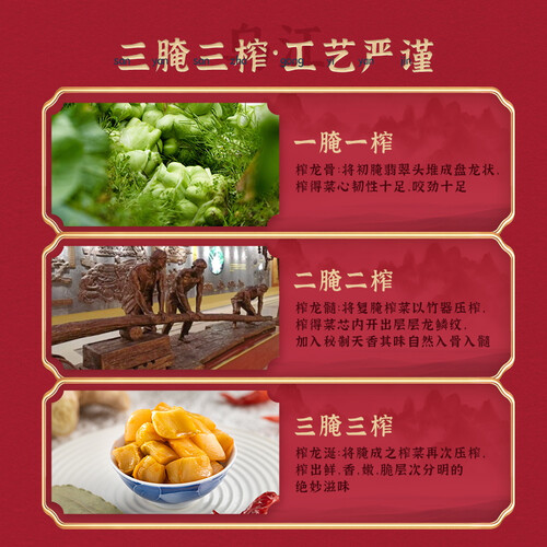精选优质青菜头,经过三腌三榨工艺,色泽金黄油亮,形状完整饱满,咸香浓郁,口感爽脆,适合用来炒菜、炖鱼、煲汤等。