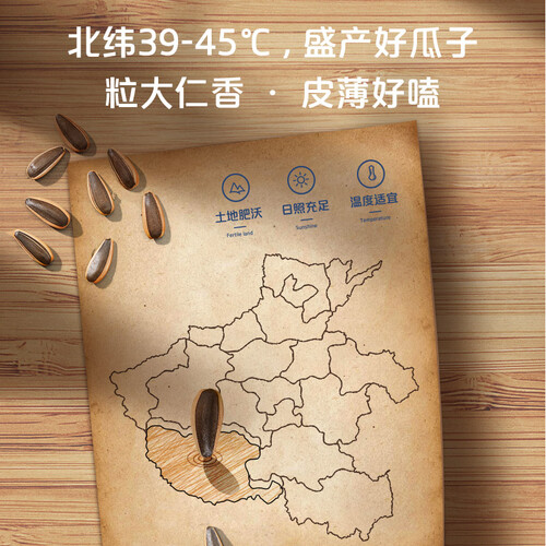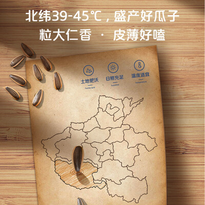 源自内蒙巴盟,拥有充足的阳光、充沛的雨水,使得葵花籽粒粒饱满均匀,粒大仁满;经煮后烘烤,松脆爽口,且伴有淡淡香味。