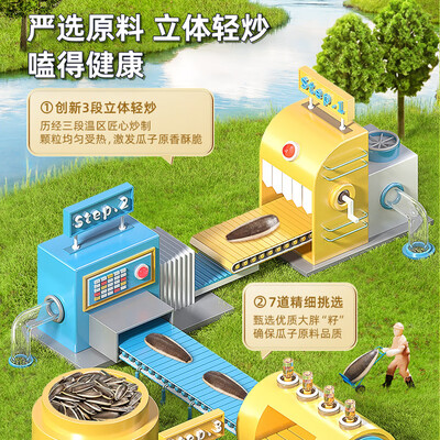 精挑细选,精心炒制,7道工序成就一颗原香瓜子。内置吸氧剂,锁住瓜子的新鲜酥脆,美味营养都兼顾,全家都爱吃。