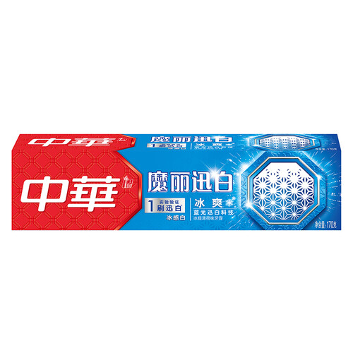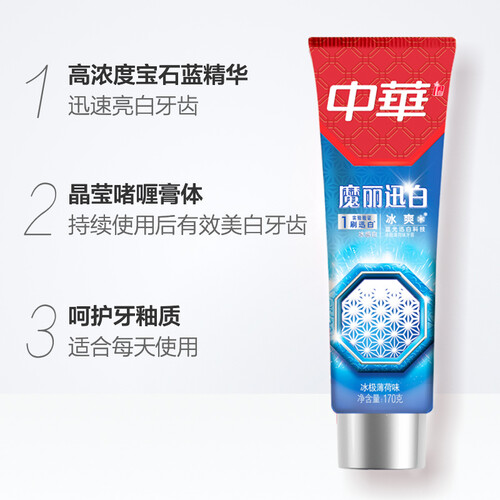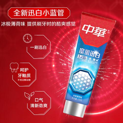 采用专利蓝光科技,丰富蓝色泡沫能够迅速修正暗黄齿色,就像给牙齿上了底妆一般,让牙齿达到迅速美白的效果。