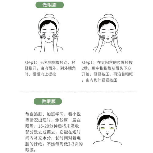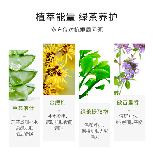 绿茶因子丨萃取芦荟精华成分,在眼部周围展开一层保护润养薄膜,防止水分流失同时提供充足水分。添加绿茶因子,保护肌肤弹力纤维部分,带来弹力有光泽的眼周轮廓。