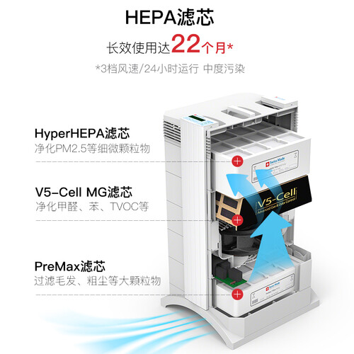 内置H13级别HEPA滤芯,能过滤白色葡糖球菌,去除PM2.5等污染源。抗霾除醛双效净化,洁净室内环境。
