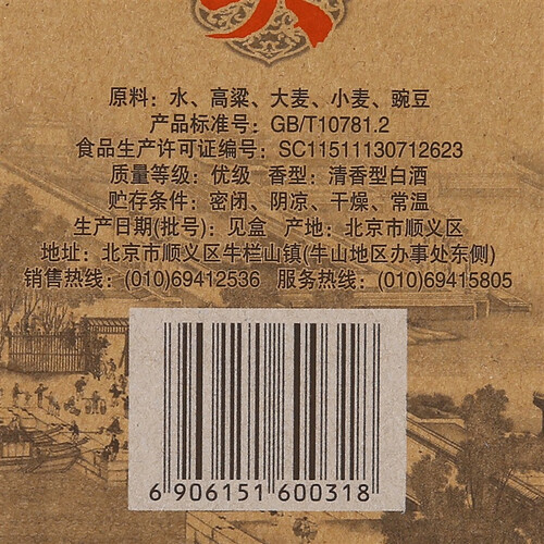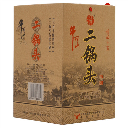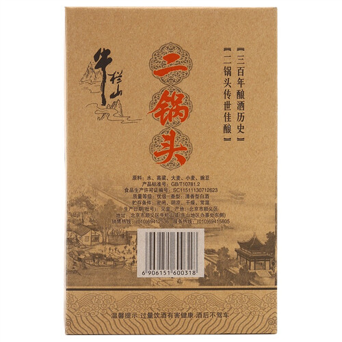 精选优质高粱、小麦、豌豆和大麦等谷物为原材料,再采用牛栏山优质的水源为媒介,经过地缸发酵,制成的白酒清甜甘香。