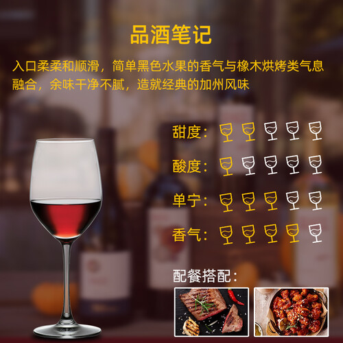 赤霞珠与西拉混酿而成,低酸的口感带来更好的饮用体验感。深红色的酒体色泽,有着醇和干净的口感,入口十分的甘美。