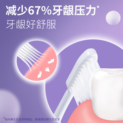 采用包胶刷柄,手感更加厚实有质感,刷牙更能防滑。精心设计软毛牙刷,质地柔软可护龈,减少牙龈承受的压力。