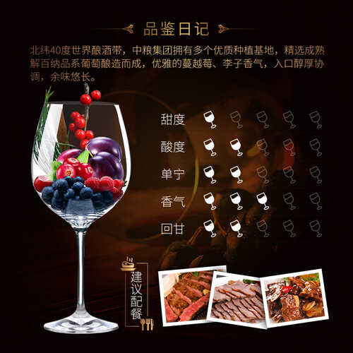 瓶口采用微氧作用小孔,能够让葡萄酒发酵成熟,带来更加醇厚酒质。这款干型红酒搭配火腿或者肉类,带给味蕾更佳体验。