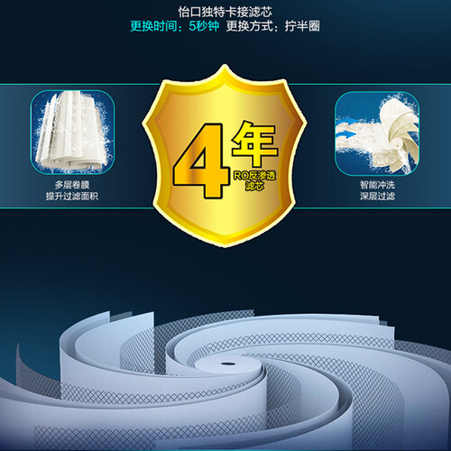 滤芯采用反渗透技术,过滤精度为0.0001微米,能有效滤除自来水中的细菌、重金属、沉淀物、铁锈等有害物质。