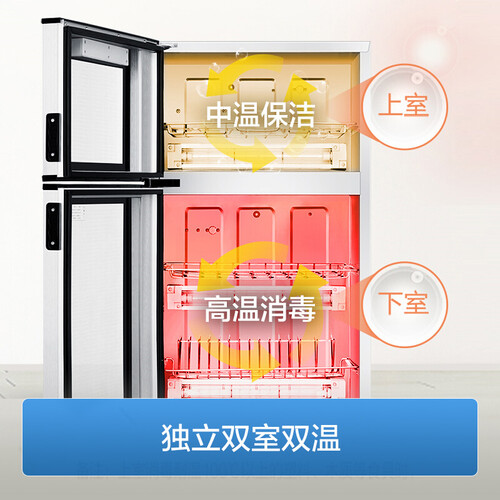 采用光波加红外线高温物理杀毒,达到二星级杀菌能力,可以有效消除顽固细菌。独立双室控温,分层消毒,更贴心更安全。