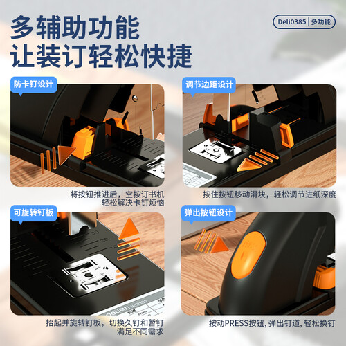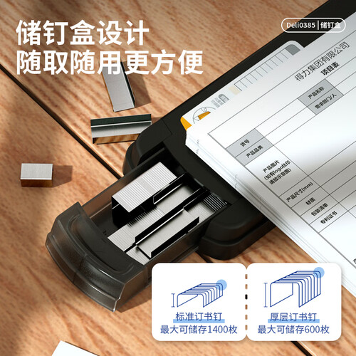 此款机身采用省力结构设计,轻轻按压即可装订,女生也能单独完成装订工作;采用弹出式钉道设计,一键轻松换针,操作简单。