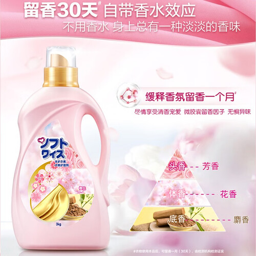 软纺因子与去静电因子经过黄金比例组合,令衣物柔韧性增强,去静电效果更好。同时自带香水效应,香氛留香一个月。