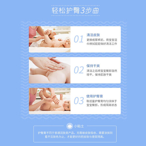 精选纯油配方,多种油性成分保护,减少屁屁摩擦感;还富含修复成分,呵护宝宝娇嫩的皮质层,给宝宝妈妈般的关爱。