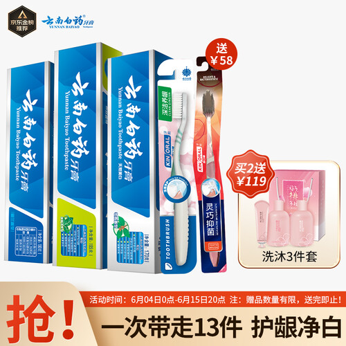 精选套装,呵护全家口腔健康。含有天然净白成分,深层次瓦解顽固牙渍,轻松拥有健康白齿。添加云南白药成分,助力口腔健康自然。