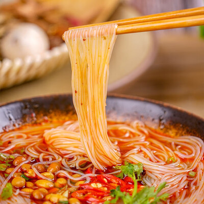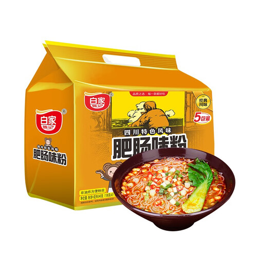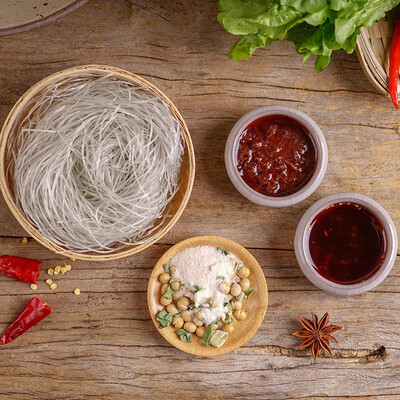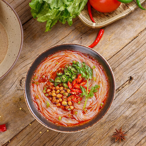 这款辣味肥肠粉的配料包里添加了秘制红油辣子和各种香料,还有用来提味增香的香葱和香酥粉脆的小黄豆。