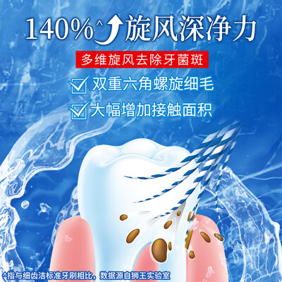 创新工艺的螺旋细毛,大大提升了清洁力度,增加了牙刷与齿面接触点,可以有效清洁牙垢及牙菌斑,清爽的配色,让你爱上刷牙。