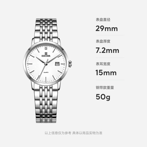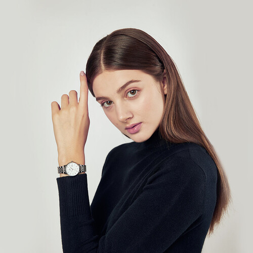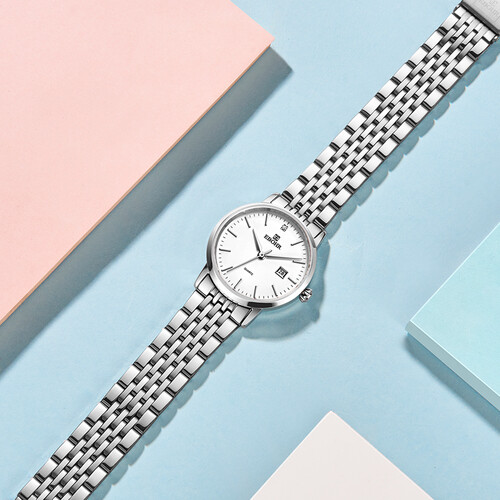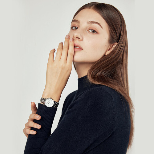 12点位点缀璀璨石钉,简约中不乏亮点,裙摆型表冠设计,充满女性柔美气质,适合多种着装风格搭配。