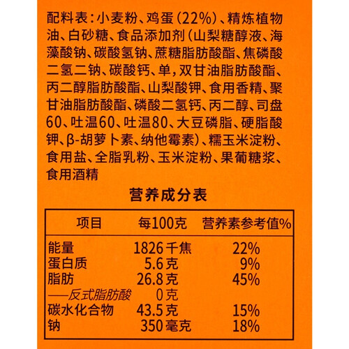 甜而不腻 | 这款康师傅妙芙奶油味蛋糕会是你加班挨饿补充元气的好助手哦~香浓松软,品味欧式味。色泽金黄诱人,满满的食欲感。口感纯正香浓,甜而不腻,口齿留香。