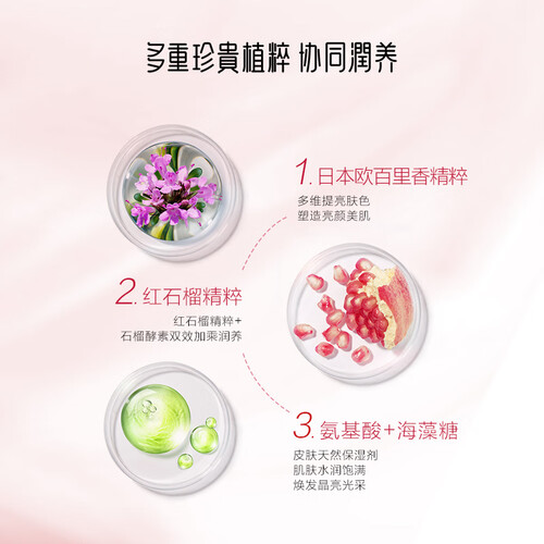 蕴含红石榴酵素,易吸收,活性物质使肌肤有活力;多种珍贵植粹协同润养,舒缓肌肤干燥;圆弧瓶身美观大气,内置刮板使用方便。