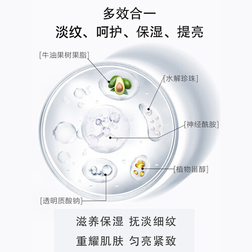面霜含有水解珍珠,打造水嫩柔润肌肤。牛油果树果脂提取物以及透明质酸钠等成分,可预防肌肤干裂,保持肌肤滋润光滑。