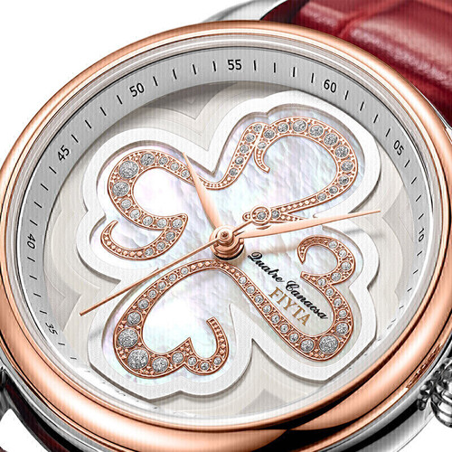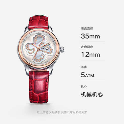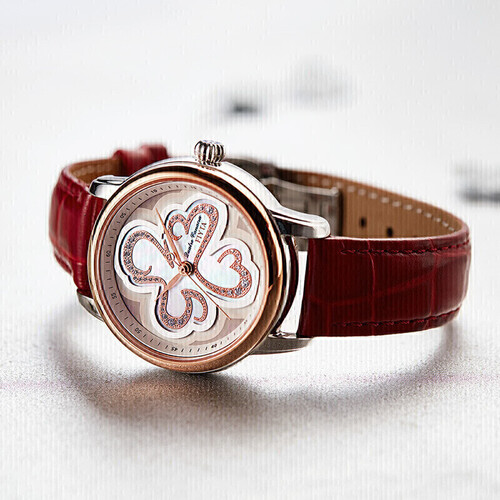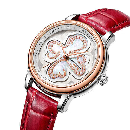灵动的四叶草造型表盘为你带来好心情,搭配稳固镶嵌的璀璨锆石,奢华贵气展露无遗。自主运转的机械机芯,时间误差小。