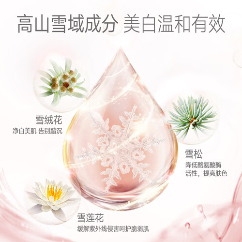 高山雪域成分,可以有效的净白美肌,淡化斑点,改善因熬夜而受损的脆弱肌肤,焕发水嫩透亮。