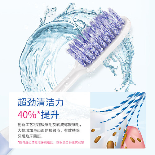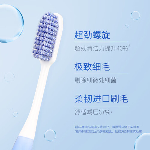创新工艺将超细软毛旋转成螺旋状,提升毛丝的韧性和回弹性,同时大幅度增加与牙齿表面的接触点,有效去除牙垢和牙菌斑。