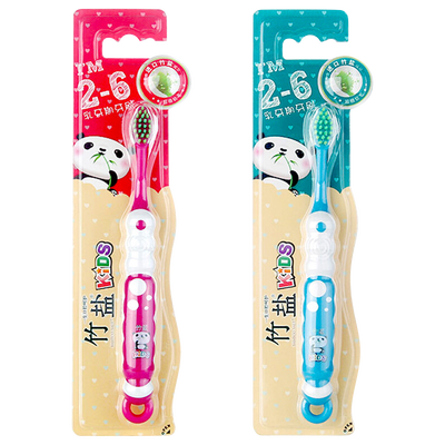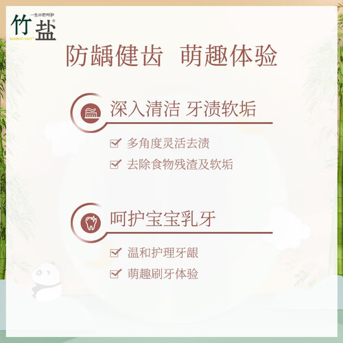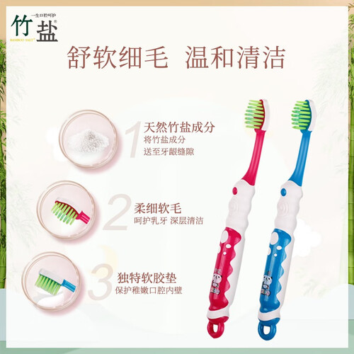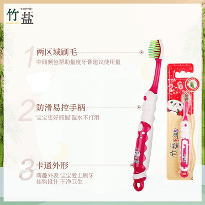 细软刷毛内含竹盐成分,轻柔清洁宝宝牙齿,使用温和,妈妈更安心;卡通防滑刷柄,宝宝易抓握更舒适,让宝宝开心刷牙。