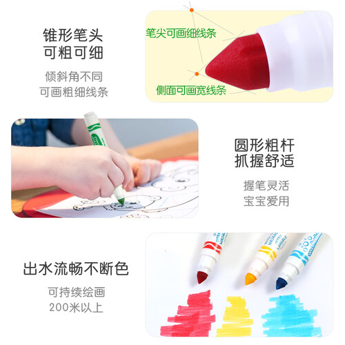 锥形造型的笔尖设计,能够随心画出粗细不同的线条。配置了12中经典色号,可有效丰富宝宝的色彩认知,培养其审美能力。